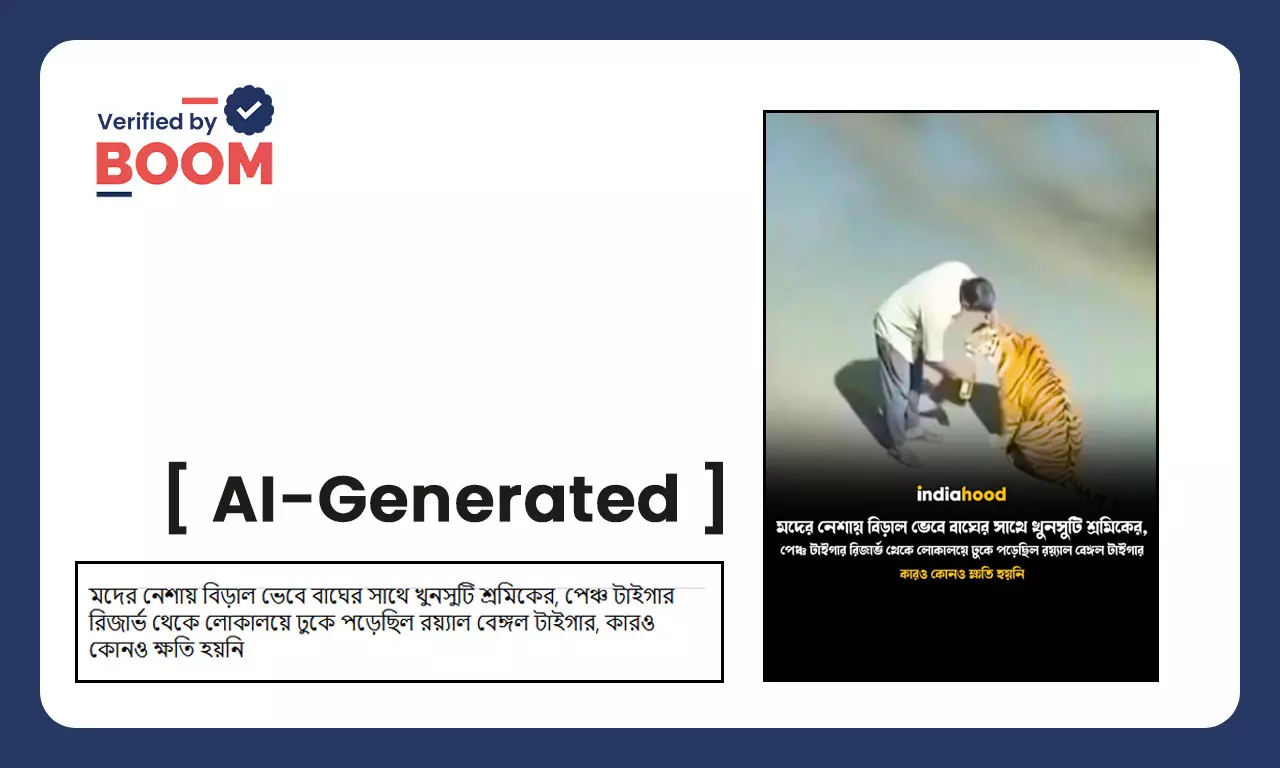 এক মদ্যপ ব্যক্তির (drunk man) রাস্তার মাঝে একটি বাঘের (tiger) গায়ে মাথায় হাত বুলিয়েও অক্ষত থাকার কৃত্রিম বুদ্ধিমত্তা (artificial intelligence) নির্মিত ভিডিও সম্প্রতি অবিশ্বাস্য কিন্তু সত্য ঘটনা দাবি করে ভাইরাল হয়েছে সমাজমাধ্যমে। ব্যবহারকারীরা ভিডিওটি শেয়ার করে ভুয়ো দাবি করেছেন ঘটনাটি বাঘ সংরক্ষণ কেন্দ্র হিসাবে জন্য খ্যাত মধ্যপ্রদেশের (Madhya Pradesh) পেঞ্চের (Pench)।