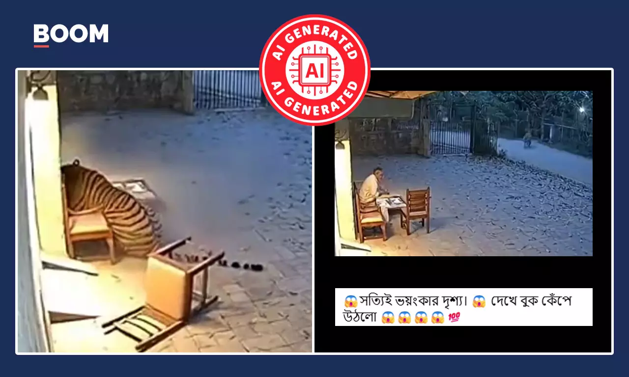 ভাইরাল ভিডিওয় বাড়ির সামনে চেয়ার-টেবিলে বসে থাকা একজন ব্যক্তিকে আক্রমণ করে তাকে জঙ্গলের দিকে টেনে নিয়ে যেতে দেখা যায় একটি বাঘকে। মহারাষ্ট্রের ঘটনার সিসিটিভি ফুটেজ দাবিতে ছড়ানোর ভিডিওয় দৃশ্যমান তারিখ অনুসারে, ঘটনাটি ৩১ অক্টোবর, ২০২৫-এ সন্ধ্যে ৬: ৪২-এ ঘটে। '