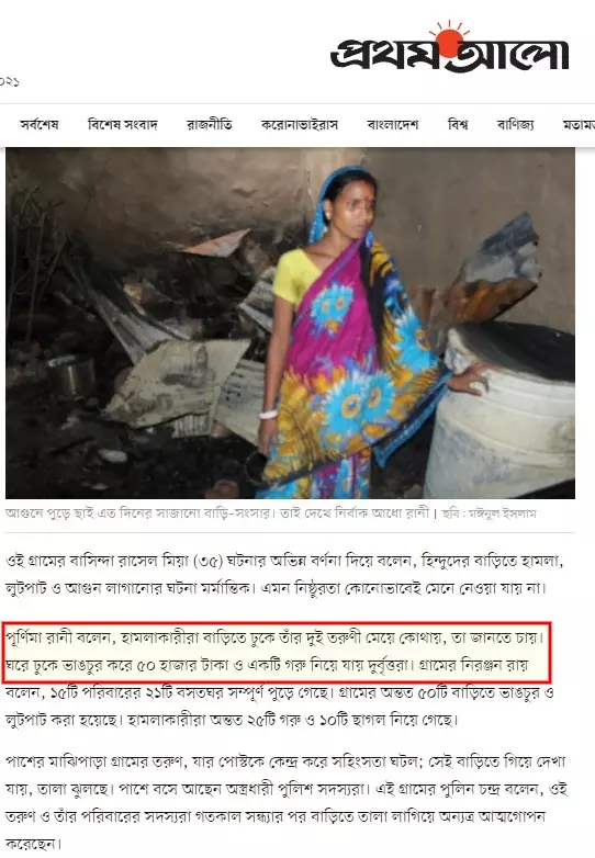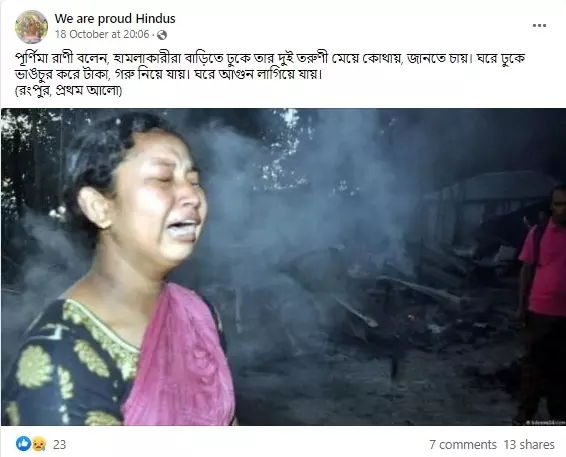 ছবিটি সোশাল মিডিয়ায় বাংলা ক্যাপশন সহ শেয়ার করা হয়। ক্যাপশনে লেখা হয়, "পূর্ণিমা রাণী বলেন, হামলাকারীরা বাড়িতে ঢুকে তার দুই তরুণী মেয়ে কোথায়, জানতে চায়। ঘরে ঢুকে ভাঙচুর করে টাকা, গরু নিয়ে যায়। ঘরে আগুন লাগিয়ে যায়। (রংপুর, প্রথম আলো)"