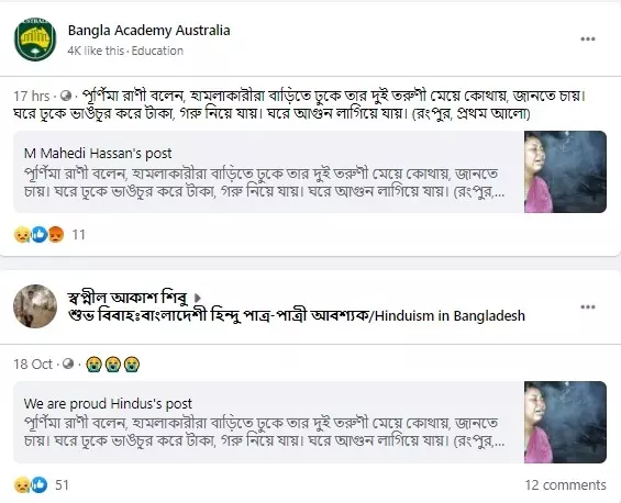 বুম দেখে ২০১৭ সালে বাংলাদেশের রংপুরে আরেক সাম্প্রদায়িক হামলার সময় ওই মহিলার বাড়ি পুড়িয়ে দেওয়া হয়।