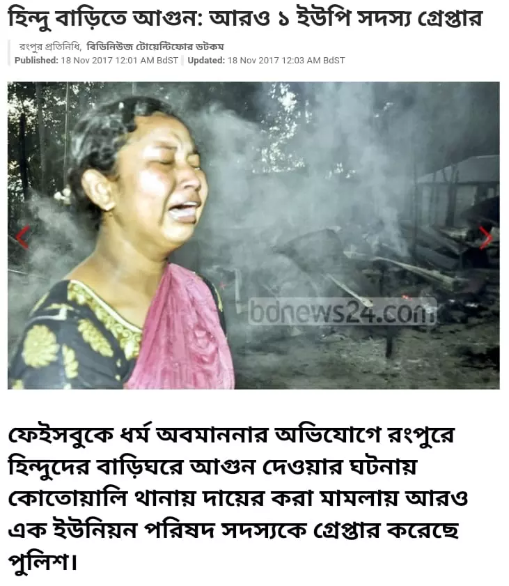 বুম দেখে, ছবিটি ২০১৭ সালের, যখন একটি ইসলাম-বিরোধী ফেসবুক পোস্টকে কেন্দ্র করে, রংপুরে হিন্দুদের বাড়িতে আগুন লাগিয়ে দেওয়া হয়।
