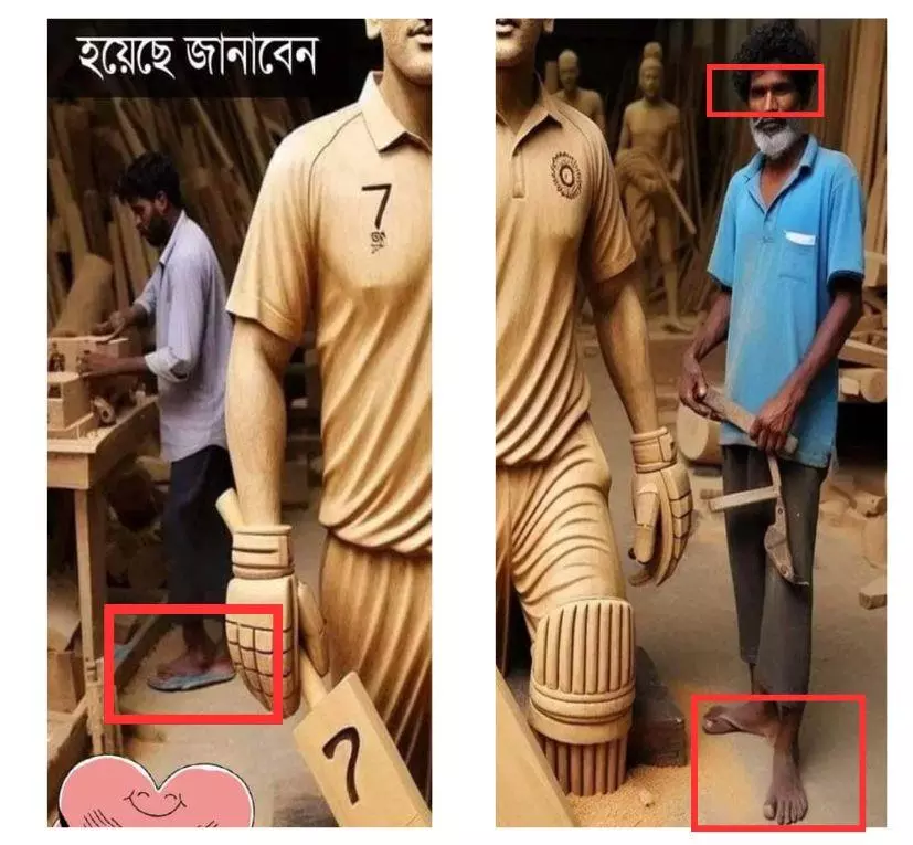 বুম ধোনির কাঠের মূর্তি দাবি করা ভাইরাল ছবিটির মধ্যে কিছু অসঙ্গতি লক্ষ্য করে। আমরা দেখি মূর্তিটির পাশে যে কাঠের শিল্পী দাঁড়িয়ে আছেন তার এক পায়ের পাতায় ছয়টি আঙুল দেখা যাচ্ছে। এছাড়াও, ছবিটি ভালো করে দেখলে ওই শিল্পীর চোখের মণিতে অসঙ্গতি দেখা যায়। আমরা আরও দেখি, তার এক পায়ের পাতার উপরে চটির স্ট্র্যাপ দেখা গেলেও পায়ে কোনও চটি নেই এবং প্রথমটি বাদে কোনও আঙুলে নখ নেই। ছবিটিতে মূর্তির পিছনে আরেকজন যে কাঠের শিল্পীকে দেখা যায় তার পায়েও কিছু অসঙ্গতি লক্ষ্য করা যায়।