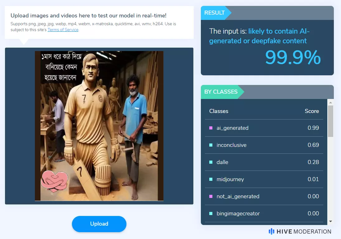 ছবির এই অস্বাভাবিকতাগুলির থেকে ইঙ্গিত নিয়ে আমরা হাইভ মডারেশনে ভাইরাল ছবিটি পরীক্ষা করে দেখি। হাইভ মডারেশনের পরীক্ষার ফলাফল অনুযায়ী ছবিটি কৃত্রিম বুদ্ধিমত্তার সাহায্যে নির্মিত। হাইভ মডারেশনের ফলাফল দেখুন নীচে।