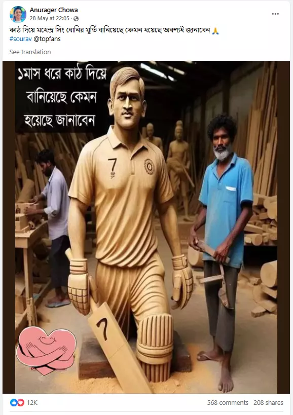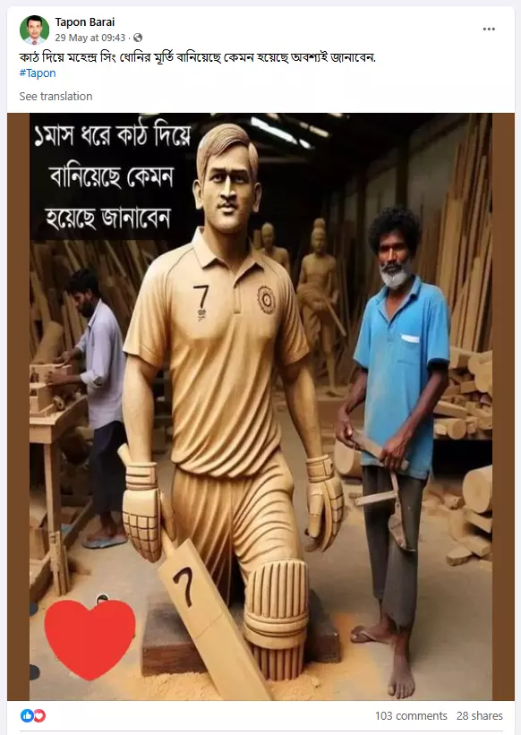 এই ছবিটি শেয়ার করে তার সাথে ক্যাপশন হিসাবে এক ফেসবুক ব্যবহারকারী লিখেছেন, "কাঠ দিয়ে মহেন্দ্র সিং ধোনির মূর্তি বানিয়েছে কেমন হয়েছে অবশ্যই জানাবেন."