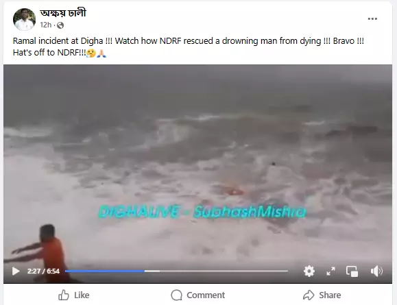 এই ভিডিওটি ফেসবুকে শেয়ার করে একজন ব্যবহারকারী ইংরেজিতে ক্যাপশন হিসাবে লিখেছেন, "রেমালের ঘটনা দীঘায়!!! দেখুন কিভাবে এনডিআরএফ একজন ডুবন্ত ব্যক্তিকে মৃত্যু থেকে উদ্ধার করল!!! ব্রাভো!!! হ্যাটস অফ টু এনডিআরএফ!!!"
