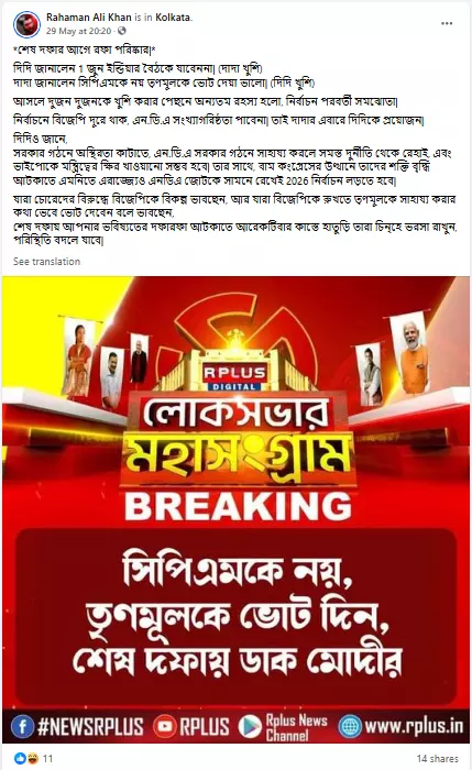 সমাজমাধ্যমে R Plus-এর গ্রাফিকের ভাইরাল স্ক্রিনশটটিতে R Plus ডিজিটালের লোগোর নীচে 'লোকসভার মহাসংগ্রাম' এবং ইংরেজিতে 'ব্রেকিং' কথাটি দেখা যায়। তার নীচে লেখা, "সিপিএম নয়, তৃণমূলকে ভোট দিন, শেষ দফায় ডাক মোদীর।"