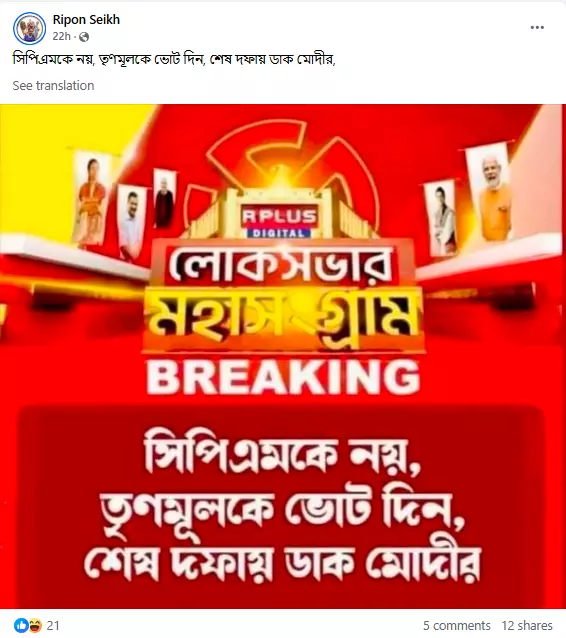 লোকসভা ভোটের মরশুমে R Plus সংবাদমাধ্যমের একটি গ্রাফিকের ভুয়ো স্ক্রিনশট সম্প্রতি ভাইরাল হয়েছে সোশ্যাল মিডিয়ায়। ওই ভুয়ো স্ক্রিনশটটি শেয়ার করে দাবি করা হয়েছে প্রধানমন্ত্রী নরেন্দ্র মোদী (Narendra Modi) পশ্চিমবঙ্গে সপ্তম দফার ভোট হওয়ার আগে জনগণকে সিপিএম (CPIM) নয় তৃণমূল কংগ্রেসকে (TMC) ভোট দিতে বলেছেন।