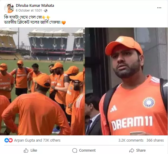 ভারতের জার্সির রংবদলের দাবিতে ভাইরাল গেরুয়া জার্সি পরে ক্রিকেটারদের ছবিগুলি পোস্ট করে ফেসবুকে লেখা হয়, "কি হাতটা থেমে গেল তো ভারতীয় ক্রিকেট দলের জার্সি গেরুয়া।"