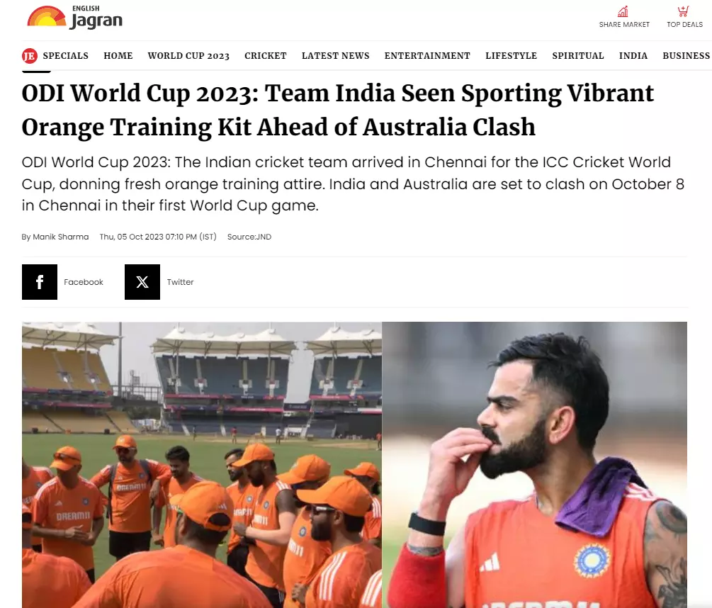 বুম প্রথমে ভাইরাল পোস্টে থাকা গেরুয়া জার্সিতে ক্রিকেটাদের ছবি রিভার্স সার্চ করে জাগরণ সংবাদমাধ্যমের অক্টোবর ৫, ২০২৩ তারিখের এক প্রতিবেদন খুঁজে পায়। ওই প্রতিবেদনে বলা বলা হয়, গেরুয়া এই জার্সি ভারতীয় ক্রিকেট দল অনুশীলনের জন্য ব্যবহার করছে।