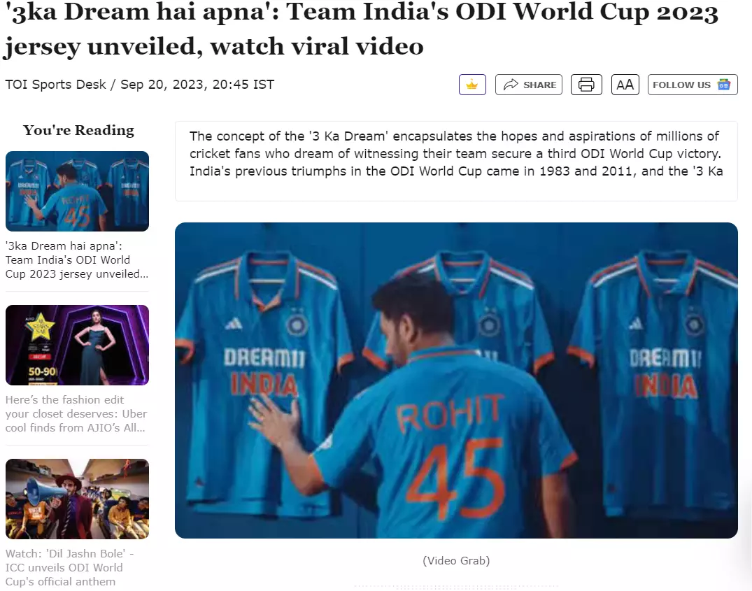 এরপর আমরা দ্য টাইমস অফ ইন্ডিয়া সংবাদমাধ্যমের সেপ্টেম্বর ২০, ২০২৩ তারিখের একটি প্রতিবেদন খুঁজে পাই যেখানে ভারতের ২০২৩ বিশ্বকাপের জার্সির উদ্বোধনের বিষয়ে রিপোর্ট করা হয়। এই প্রতিবেদনে উপস্থিত তথ্য অনুযায়ী, ভারতীয় দল বিশ্বকাপ ম্যাচের সময় নীল রঙের জার্সিই পড়বে। সেই প্রতিবেদন পড়তে ক্লিক করুন এখানে।