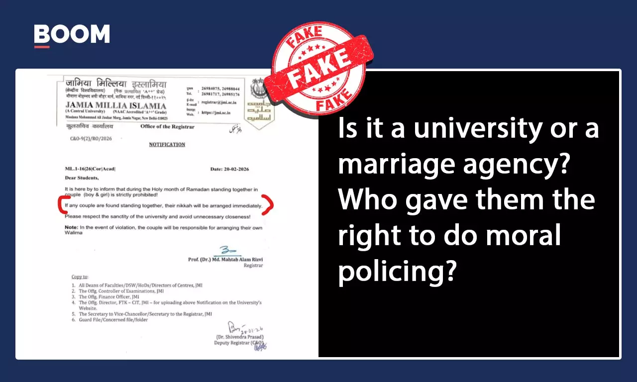 দিল্লির জামিয়া মিলিয়া ইসলামিয়া বিশ্ববিদ্যালয়ের (Jamia Millia Islamia University) নাম করে সমাজমাধ্যমে ভাইরাল এক বিজ্ঞপ্তিতে সম্প্রতি দাবি করা হয়, রমজান মাসে ক্যাম্পাসে একসঙ্গে দেখা গেলে জুটিদের অবিলম্বে বিয়ে (নিকাহ) দেওয়ার নির্দেশ দিয়েছে বিশ্ববিদ্যালয়।