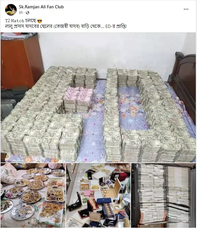 ফেসবুক পোস্টে ভাইরাল হওয়া ৫ টি ছবিতে দেখা যায়, বিছানাতে ইডির ইংরেজি আদ্যাক্ষরে সাজিয়ে রাখা টাকার বান্ডিল, সোনার গয়না, সোনার বাট এবং সুটকেসে রাখা টাকা। ছবিগুলি ফেসবুকে শেয়ার করে ক্যাপশনে লেখা হয়েছে, "𝚃2 𝙼𝚊𝚝𝚌𝚑 চলছে। লালু প্রসাদ যাদবের ছেলের (তেজস্বী যাদব) বাড়ি থেকে.... ED-র প্রাপ্তি!"