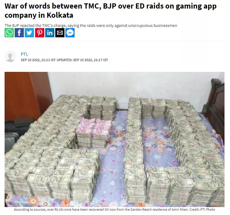 মোবাইল গেমিং অ্যাপ সংক্রান্ত দুর্নীতির তদন্তে ইডি কলকাতার ব্যবসায়ী নাসির খান ও তার ছেলে আমির খানের গার্ডেনরিচের বাড়ি থেকে ১৬ কোটি টাকা উদ্ধার করে। একই ছবি দেখা যাবে হিন্দুস্তান টাইমসের প্রতিবেদনে।
