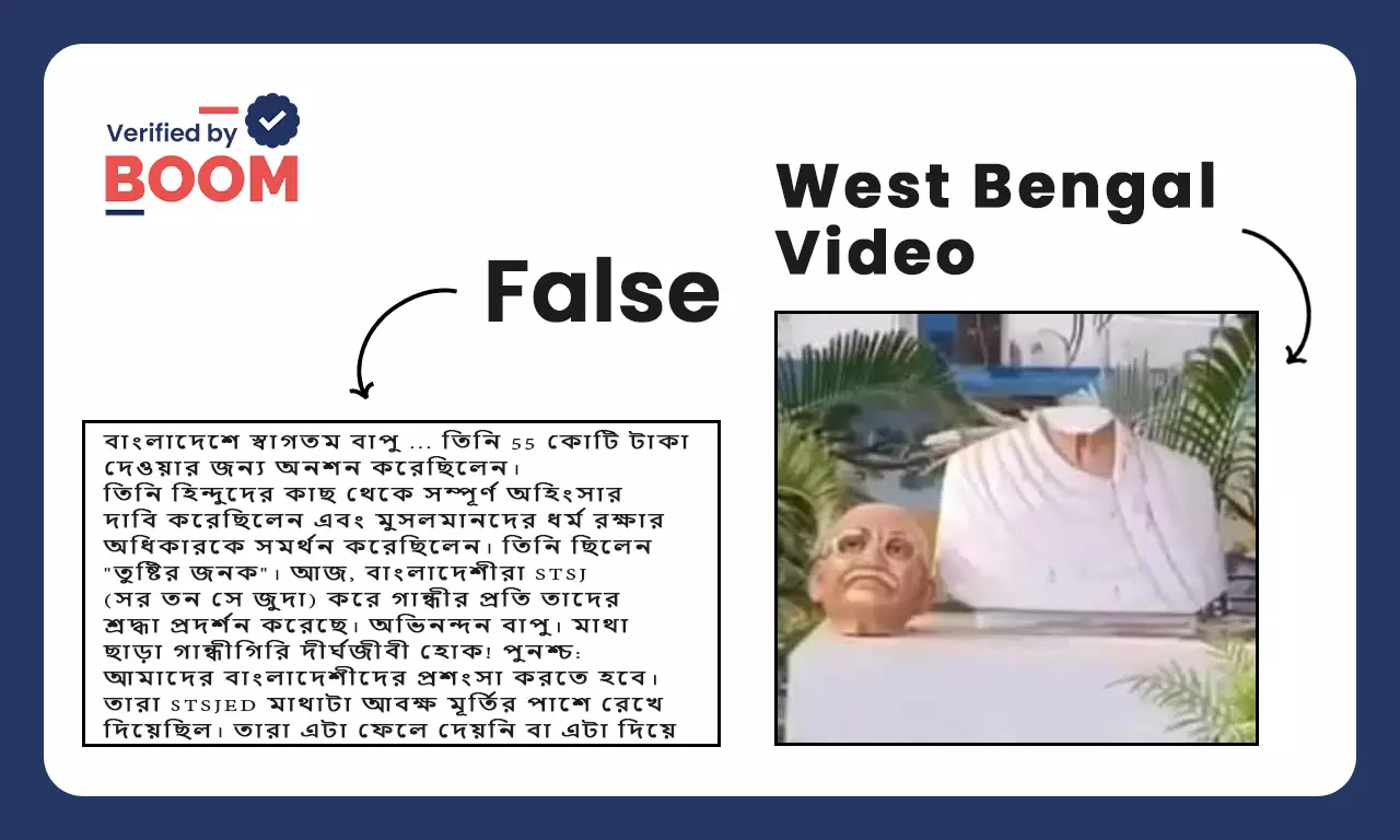 সম্প্রতি সোশ্যাল মিডিয়ায় পশ্চিমবঙ্গের (West Bengal) উত্তর দিনাজপুর (North Dinajpur) জেলার একটি মাথা ভাঙা মহাত্মা গান্ধী মূর্তির (Gandhi statue) ছবি ও ভিডিও বাংলাদেশের (Bangladesh) দাবি করে ভাইরাল হয়েছে।