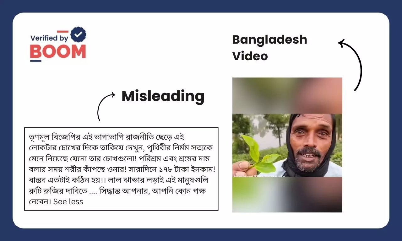 দৈনিক ১৭৮ টাকার মজুরিতে (wages) পশ্চিমবঙ্গে (West Bengal) এক চা-শ্রমিক ২৩ কেজি চা পাতা (tea leaves) তুলছেন দাবি করে সম্প্রতি এক ভিডিও ভাইরাল হয় সমাজমাধ্যমে।
