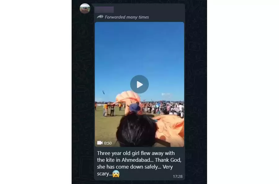 আমরা দেখি, ভিডিওটি হোয়াটসঅ্যাপে শেয়ার করা হচ্ছে। সেটির ক্যাপশনে বলা হয়েছে, “আমদাবাদে, একটি ঘুড়ির সঙ্গে উড়ে গেল ৩ বছরের এক মেয়ে। ভাগ্য ভাল যে সে নিরাপদে নীচে নেমে আসতে পেরেছে। খুবই ভয়ের ব্যাপার...?”