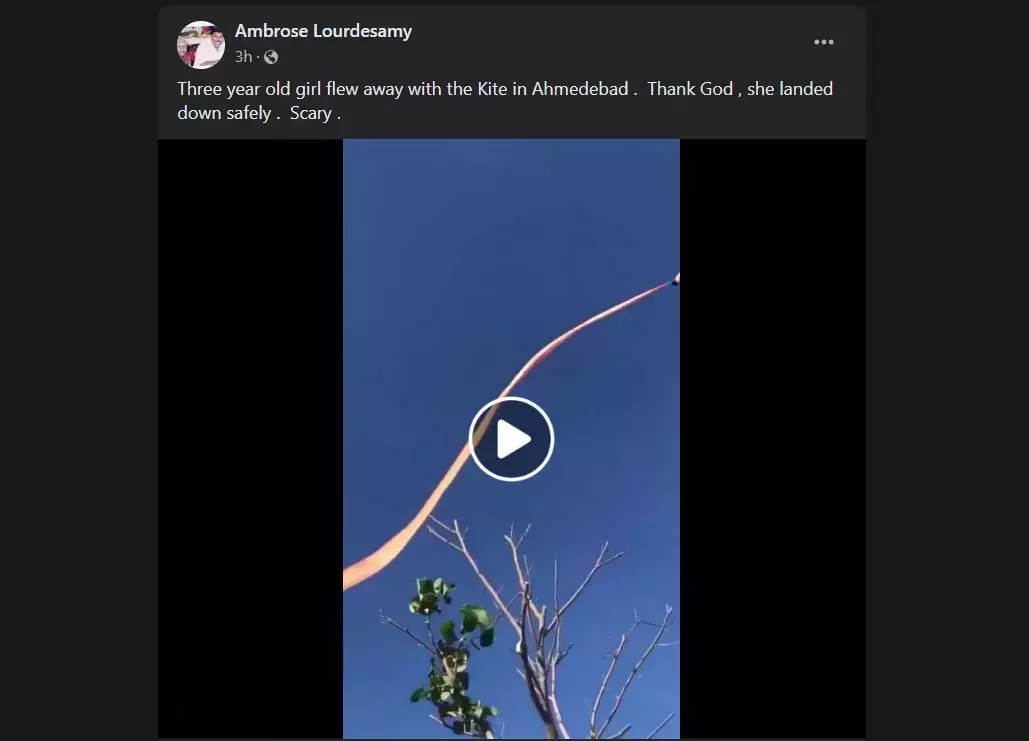 বিরাট এক ঘুড়ির (giant kite) সঙ্গে জড়িয়ে গিয়ে একটি শিশু কন্যাকে শূন্যে উঠে যেতে দেখা যাচ্ছে একটি ভিডিওতে। ভিডিওটি সোশাল মিডিয়ায় এই বলে শেয়ার করা হচ্ছে যে, আমদাবাদে (Ahmedabad) ৩ বছরের একটি মেয়ে বৃহৎ এক ঘুড়ির সঙ্গে জড়িয়ে গিয়ে শূন্যে উঠে যায়।