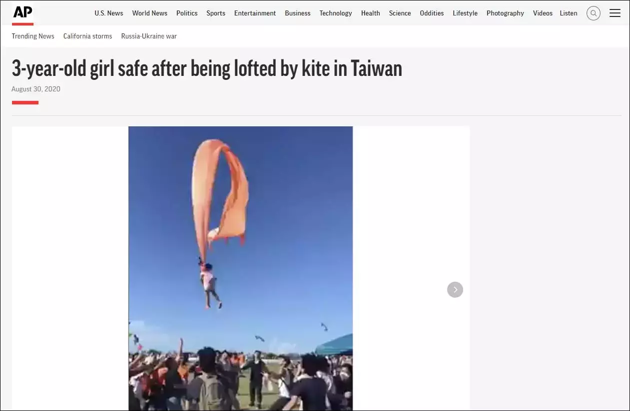 ২০২০ সালের ভিডিওটিতে তাইওয়ানের ঘুড়ি উৎসবে বিরাট এক ঘুড়ির সঙ্গে জড়িয়ে গেলে ৩ বছরের শিশুকে ওপরে উঠে যেতে দেখা যায়।