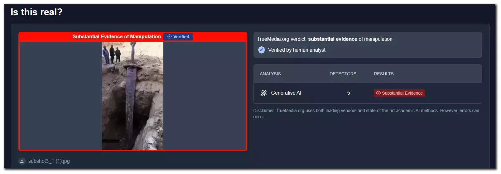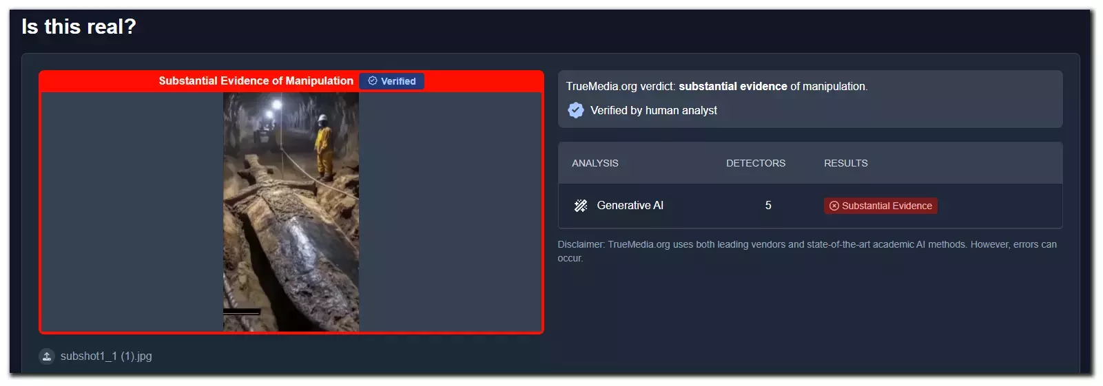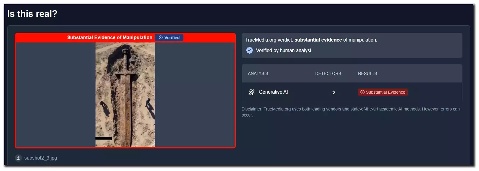 ওই পরীক্ষার ফলাফলে ছবিগুলিতে যথেষ্ট পরিমাণে কৃত্রিম বুদ্ধিমত্তা ব্যবহারের প্রমাণ পাওয়ার উল্লেখ করা হয়। এছাড়াও আমরা ট্রুমিডিয়ার সাথে ইমেল মারফত যোগাযোগ করলে ওই সংস্থার একজন মানব যাচাইকারী নিশ্চিত করেন ছবিগুলি ভুয়ো ও কৃত্রিম বুদ্ধিমত্তার প্রয়োগে তৈরি বলে জানান।