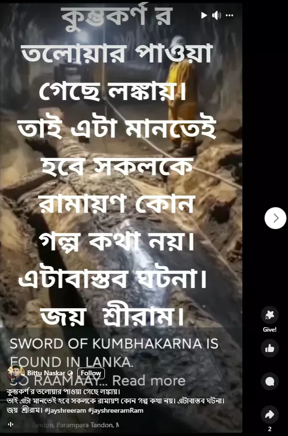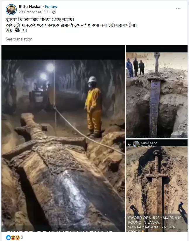 এক ফেসবুক ব্যবহারকারী তিনটি ছবি শেয়ার করে ক্যাপশনে দাবি করেছেন, "কুম্ভকর্ণ র তলোয়ার পাওয়া গেছে লঙ্কায়। তাই এটা মানতেই হবে সকলকে রামায়ণ কোন গল্প কথা নয়। এটাবাস্তব ঘটনা। জয় শ্রীরাম।"