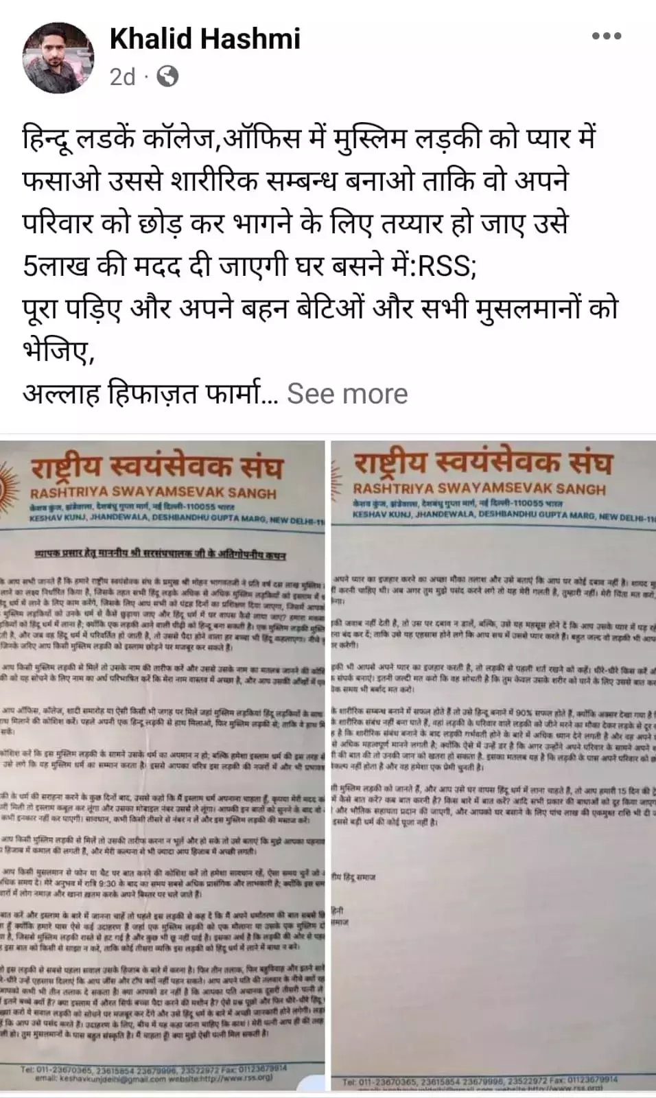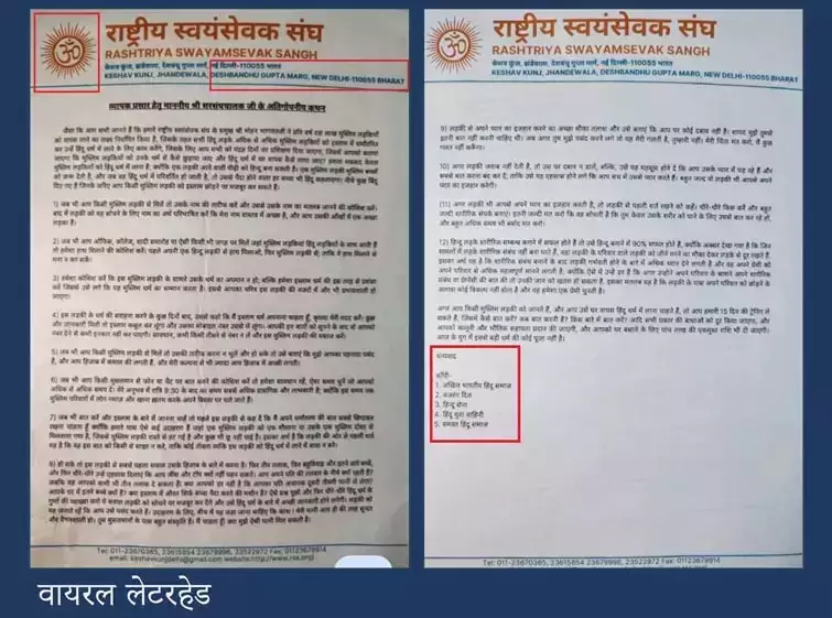 দক্ষিণপন্থী হিন্দু সংগঠন আরএসএস-এর (RSS) লেটারহেডে (Letterhead) লেখা একটি চিঠি (letter) এই ভুয়ো দাবি সহ অনলাইনে ভাইরাল করা হয়েছে যে, হিন্দু পুরুষদের আরএসএস (RSS) নির্দেশ দিয়েছে মুসলিম মহিলাদের লোভ দেখিয়ে তাদের হিন্দু ধর্মে ধর্মান্তরিত করতে।