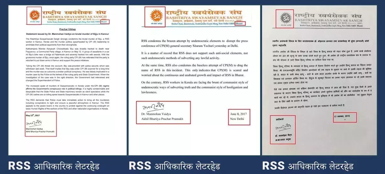 আরএসএস-এর আসল লেটারহেডে ‘ভারত’ শব্দটি তার ঠিকানার মধ্যে বন্ধনীর মধ্যে লেখা থাকে, যা এই চিঠিতে নেই।