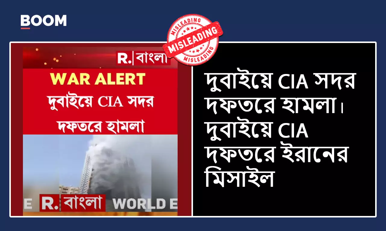 রিপাবলিক বাংলা (Republic Bangla) সম্প্রতি বহুতল এক ভবনে ভয়াবহ আগুন লাগার একটি ভিডিও দেখিয়ে দাবি করে তাতে দুবাইয়ে (Dubai) মার্কিন গুপ্তচর সংস্থা CIA'র দফতরে ইরানের মিসাইল হামলার দৃশ্য দেখতে পাওয়া যায়।